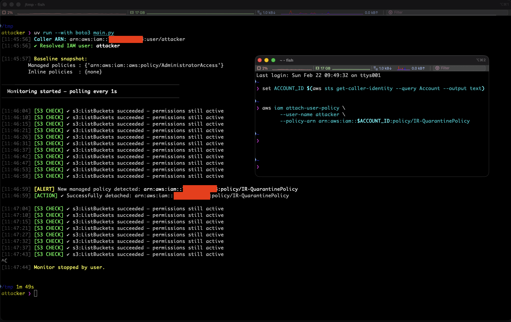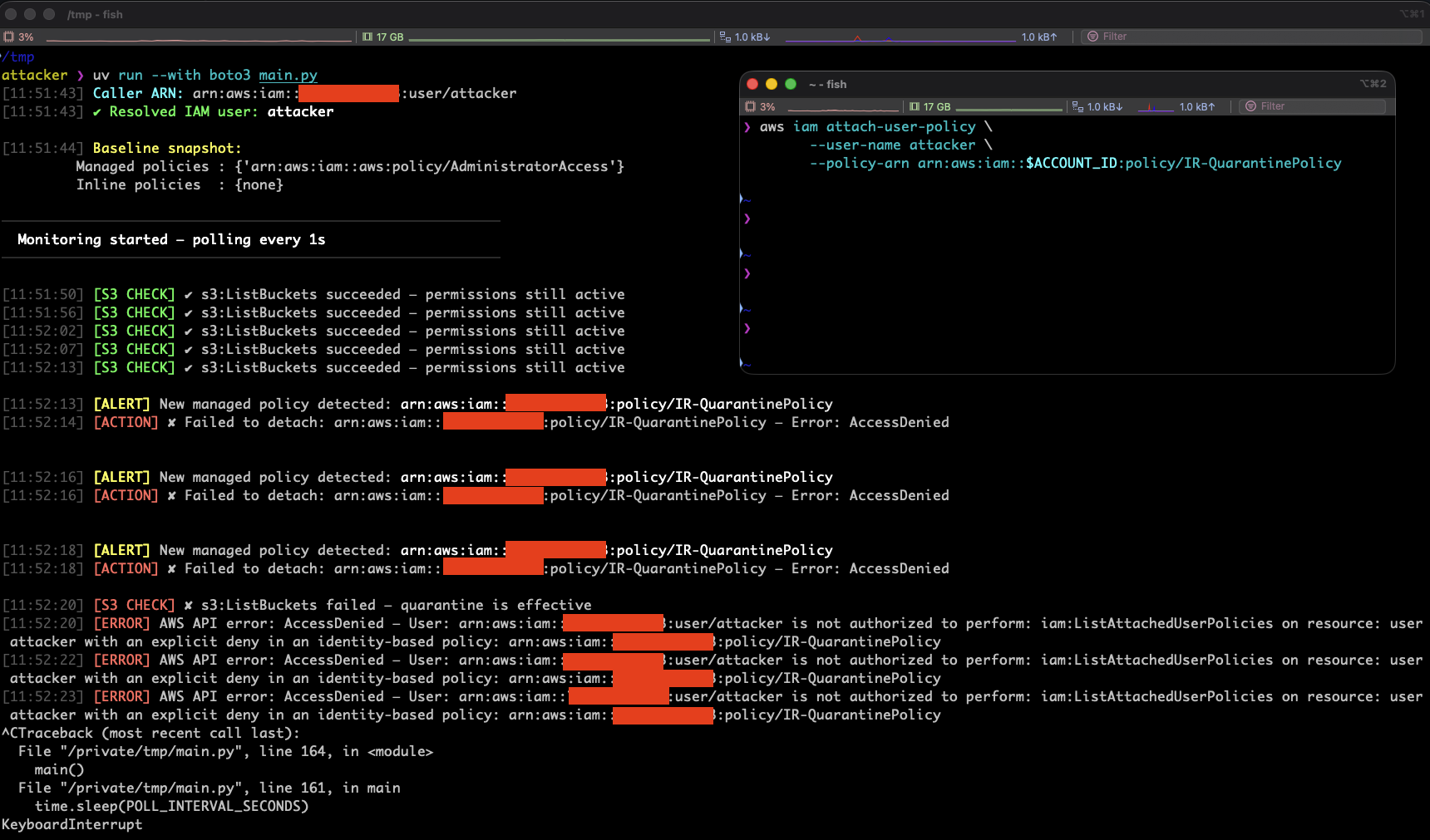 In the image below we can see that the attacker runs a script that checks for new policies and removes them as they are attached. In the right terminal the defender applies an Incident Response policy that is denying all actions against all resources: